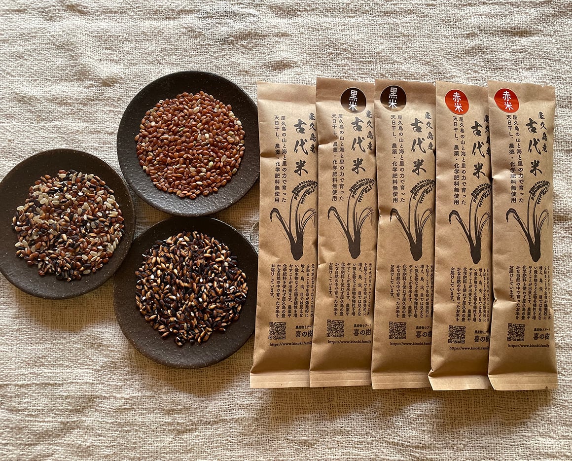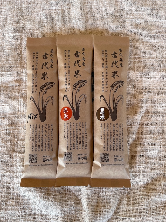 古代米黒米と赤米2本づつ、黒米・赤米・玄米のミックス米をセットにした商品です。